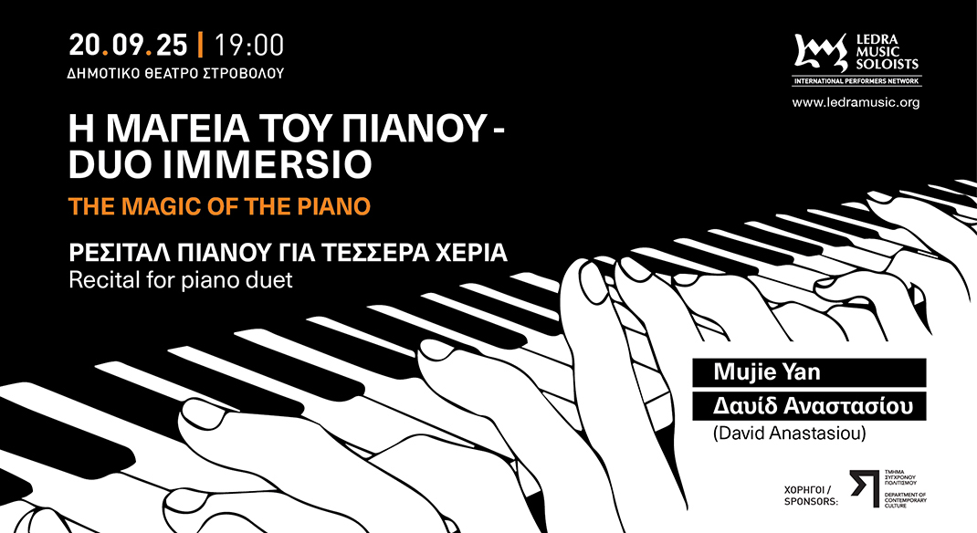 Ledra Music Soloists invites you to a special evening of piano four-hands music with Duo Immersio, the rising Scotland-based ensemble formed by Mujie Yan and David Anastasiou. This concert marks Duo Immersio’s debut performance in Cyprus.